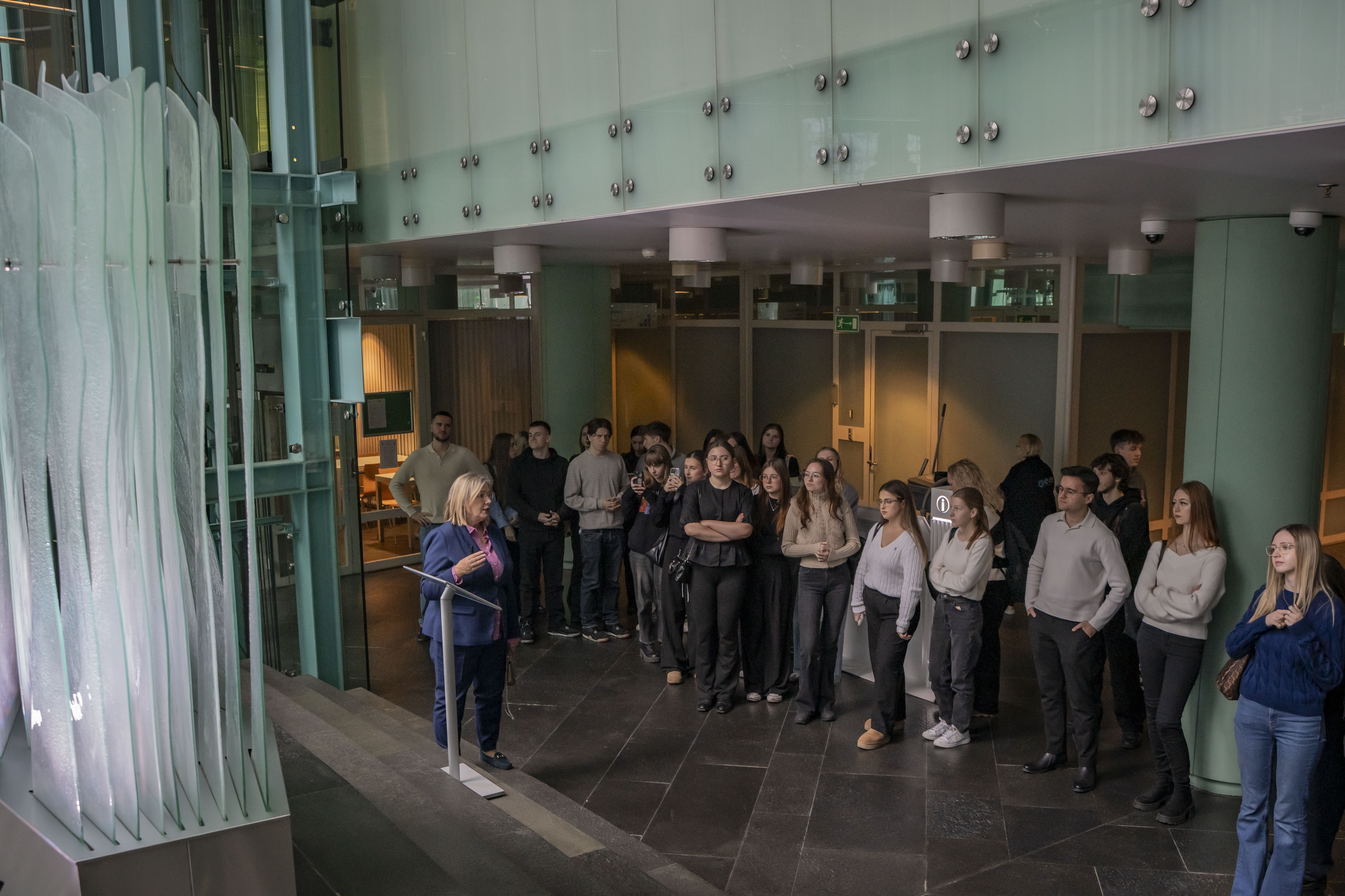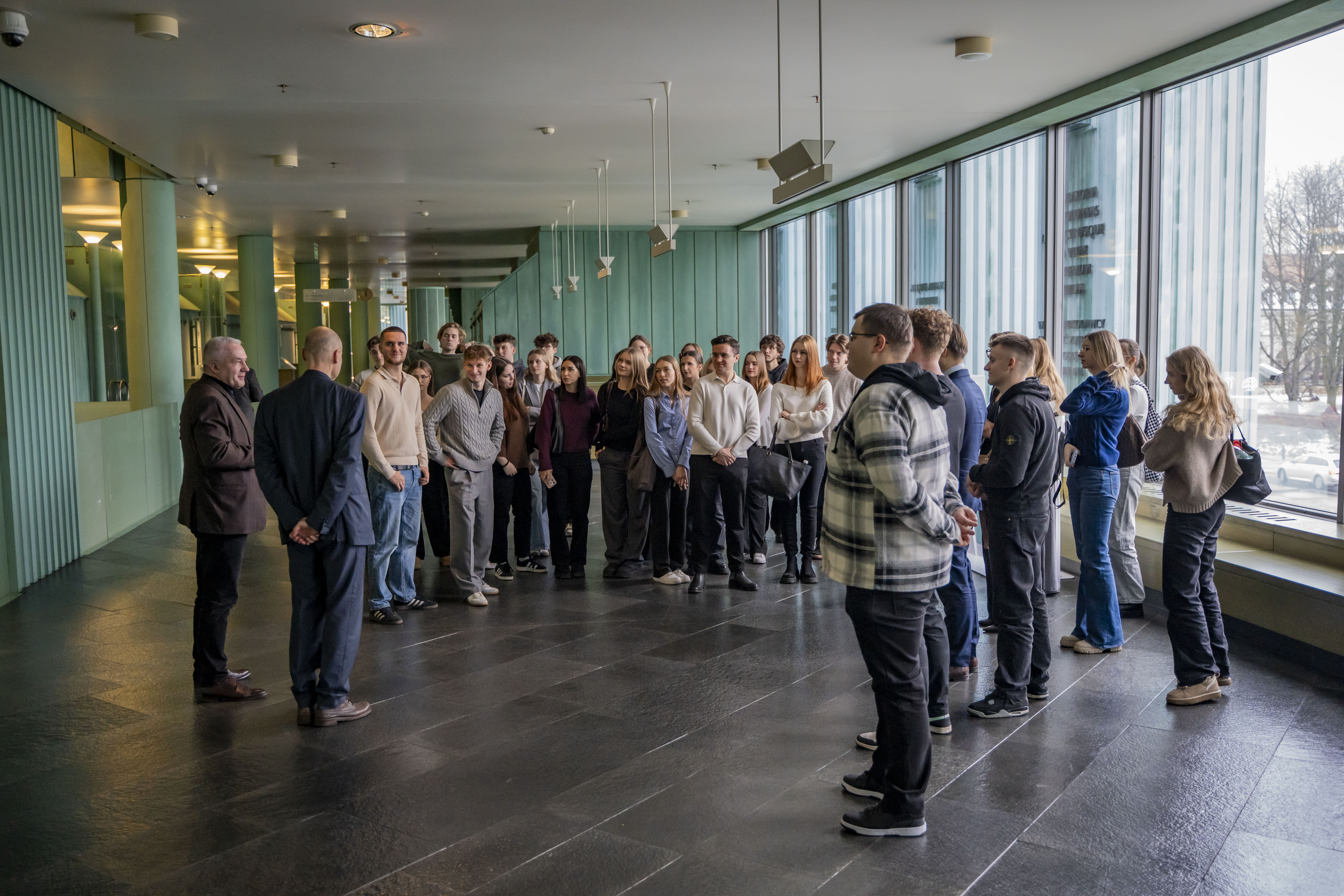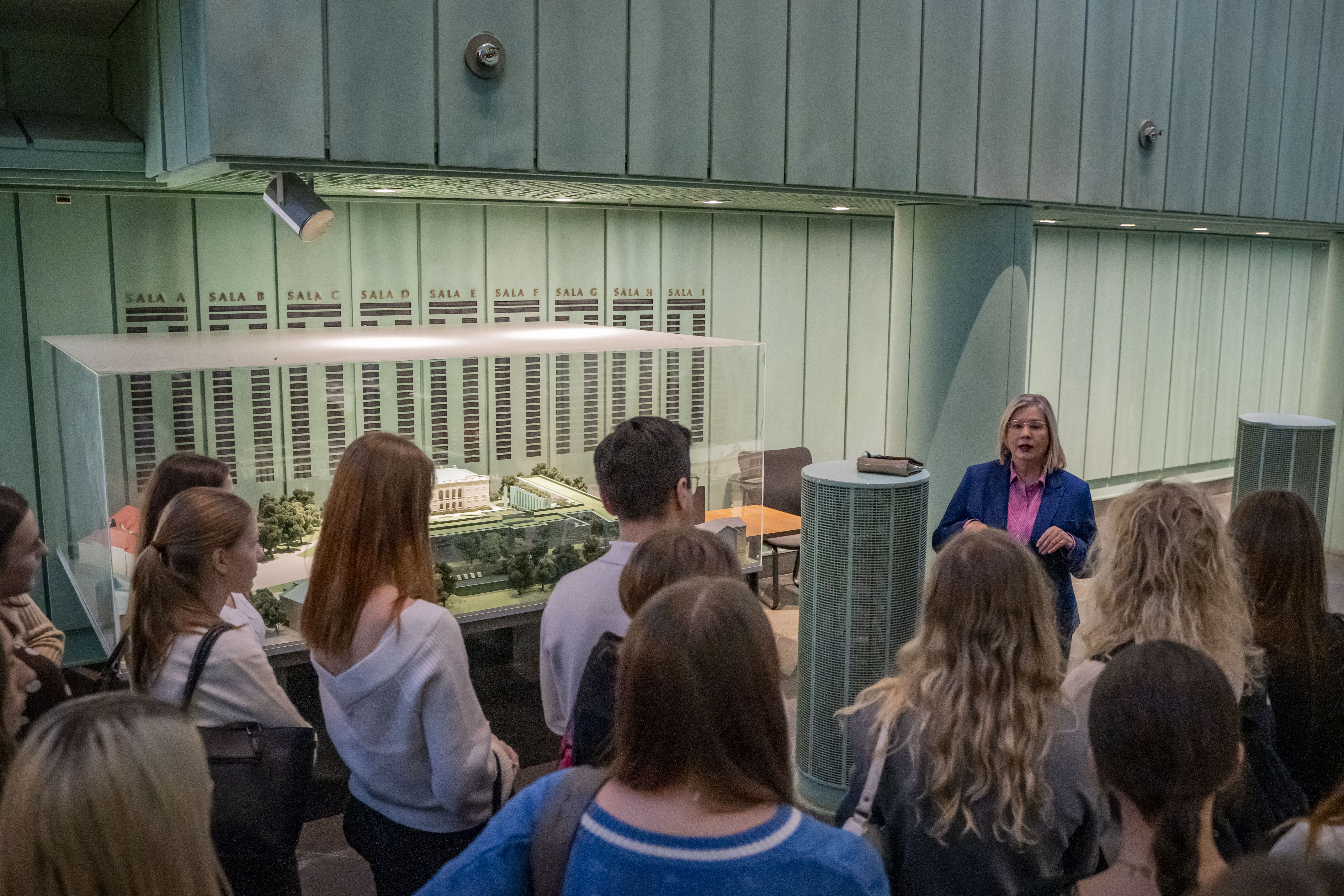 W największej sali posiedzeń Sądu Najwyższego studenci obejrzeli film o historii Sądu Najwyższego w Polsce, budynku Sądu, tzw. dzielnicy sądowej zlokalizowanej na placu Krasińskich oraz o pierwszym budynku Sądu Najwyższego mieszczącym się w Pałacu Krasińskich, zwanym także Pałacem Rzeczypospolitej – symbolu odradzającej się państwowości polskiej po zaborach.
